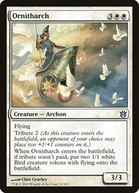 When Ornitharch enters the battlefield, if tribute wasn't paid, put two 1/1 white Bird creature tokens with flying onto the battlefield.
