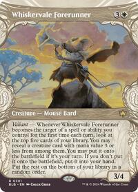 Valiant — Whenever Whiskervale Forerunner becomes the target of a spell or ability you control for the first time each turn, look at the top five cards of your library. You may reveal a creature card with mana value 3 or less from among them. You may put it onto the battlefield if it's your turn. If you don't put it onto the battlefield, put it into your hand. Put the rest on the bottom of your library in a random order.